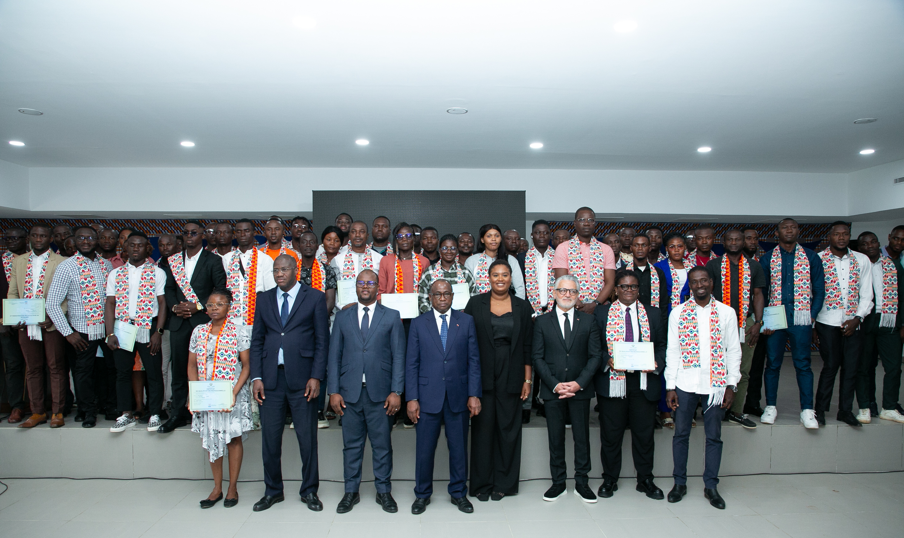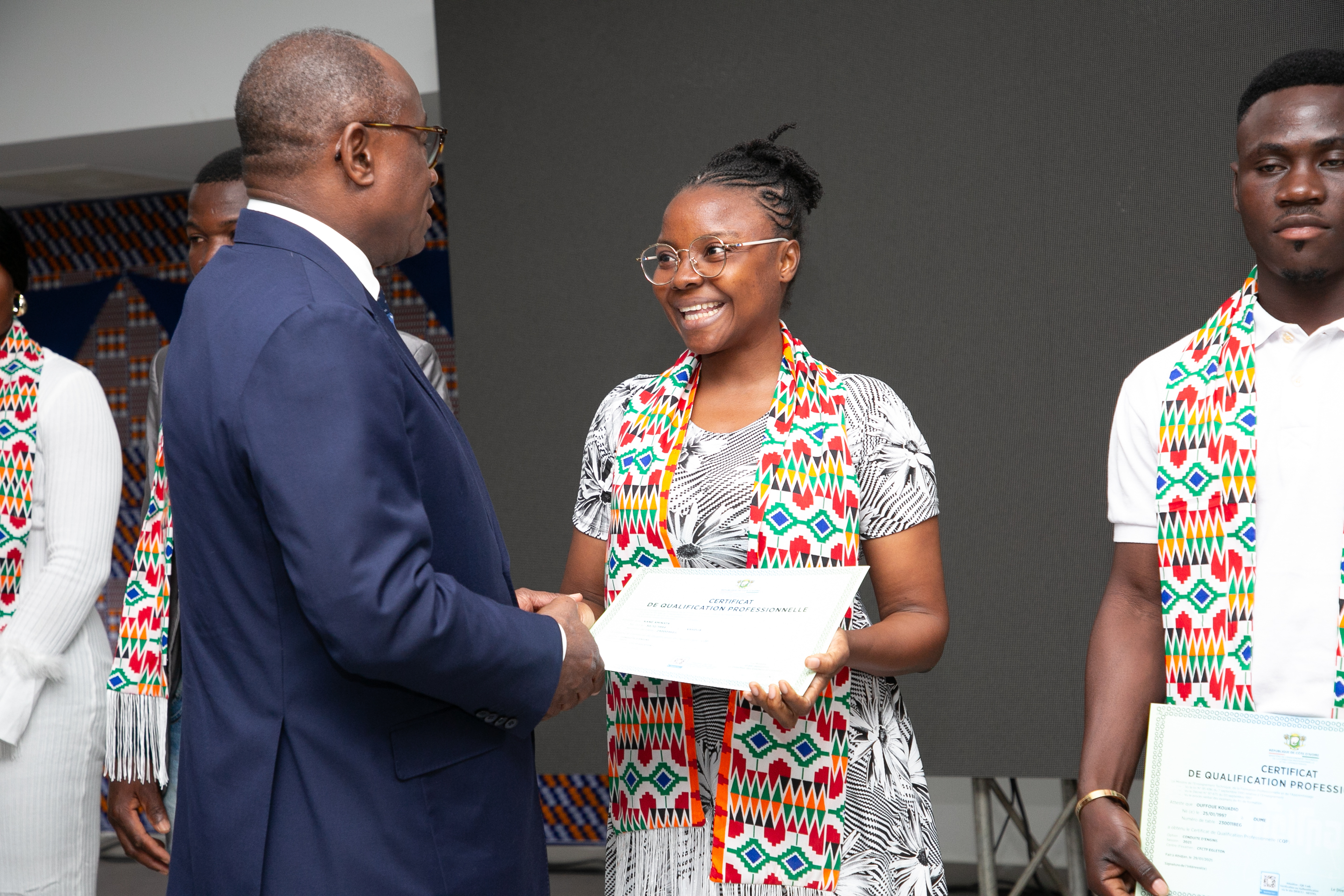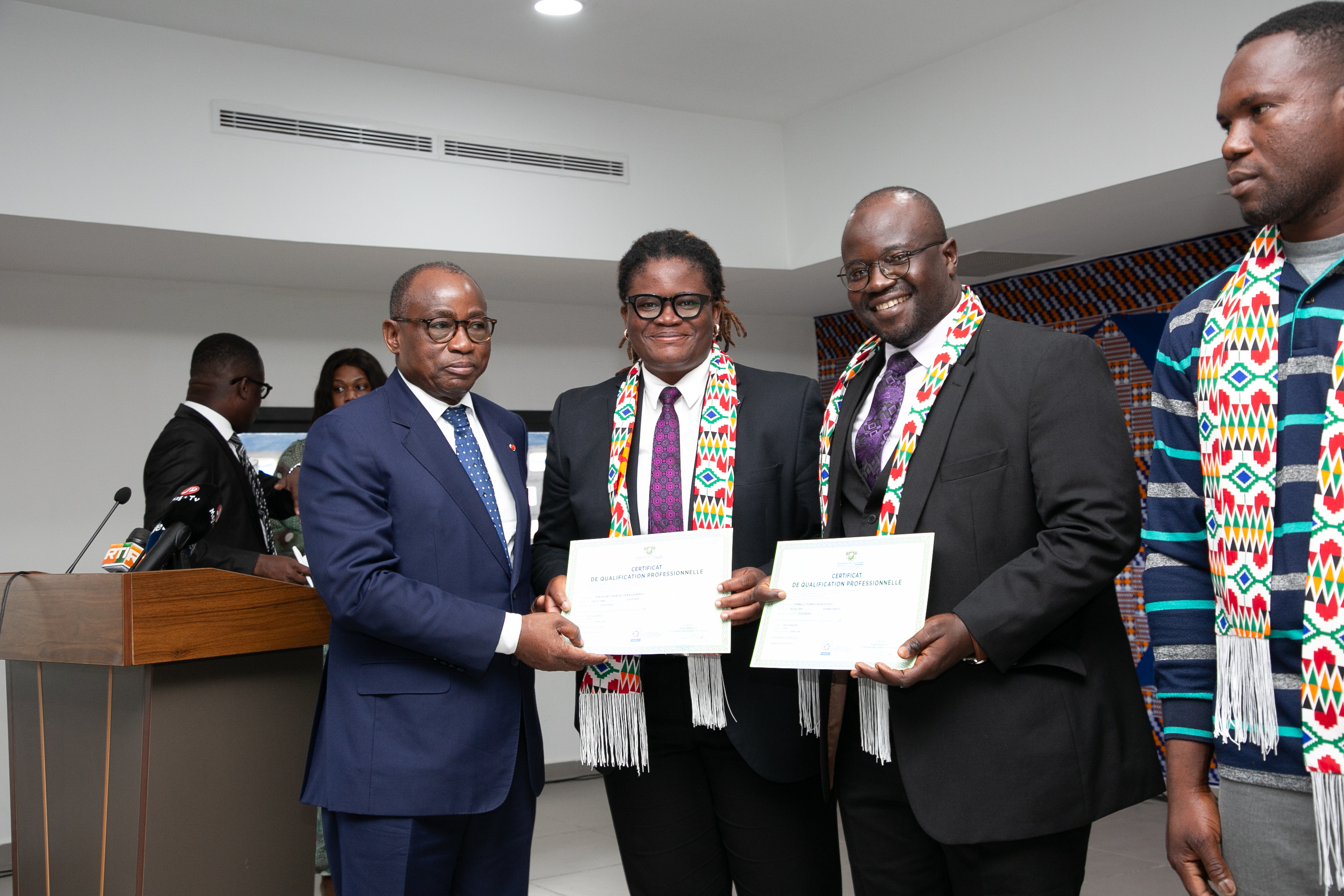 Abidjan, le 09 octobre 2025- Au total, 385 jeunes formés aux métiers de la grande distribution en Côte d’Ivoire et 168 aux métiers du BTP et de l’audiovisuel à Egletons, en France, ont officiellement reçu leur Certificat de qualification professionnelle (CQP), au cours d’une cérémonie présidée par le ministre de l'Enseignement technique, de la Formation professionnelle et de l'Apprentissage, N'Guessan Koffi.