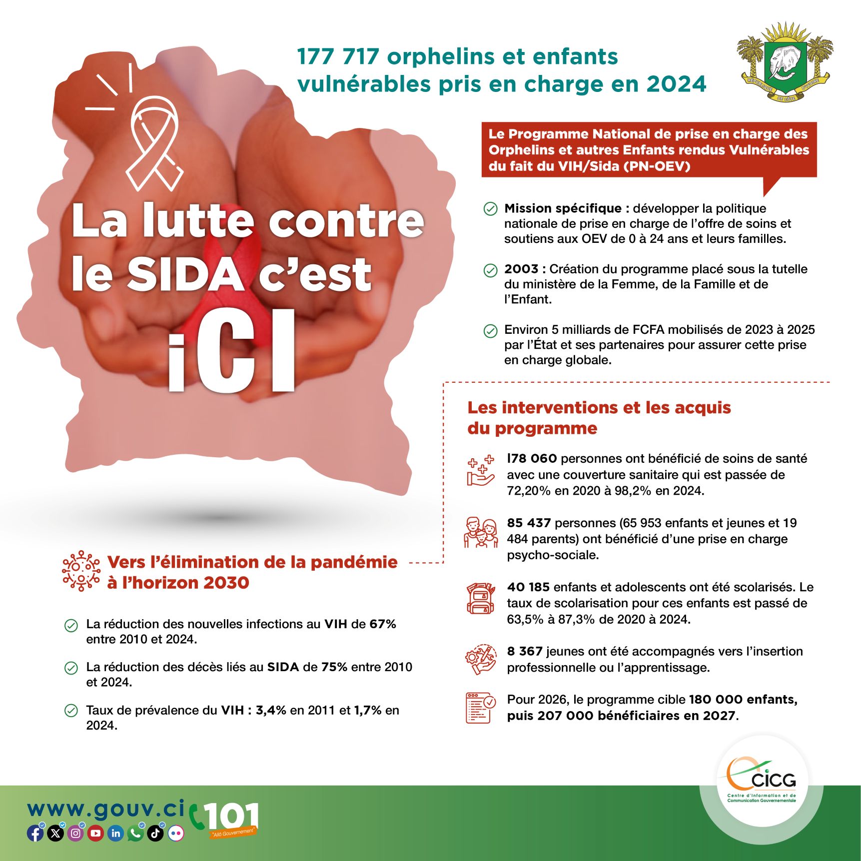 La Côte d’Ivoire est engagée pour l’élimination de la pandémie du Sida à l’horizon 2030. En attendant l’atteinte de cet objectif majeur, le pays a mis en œuvre de nombreuses initiatives dont le Programme National de prise en charge des Orphelins et autres Enfants rendus Vulnérables du fait du VIH/Sida (PN-OEV).