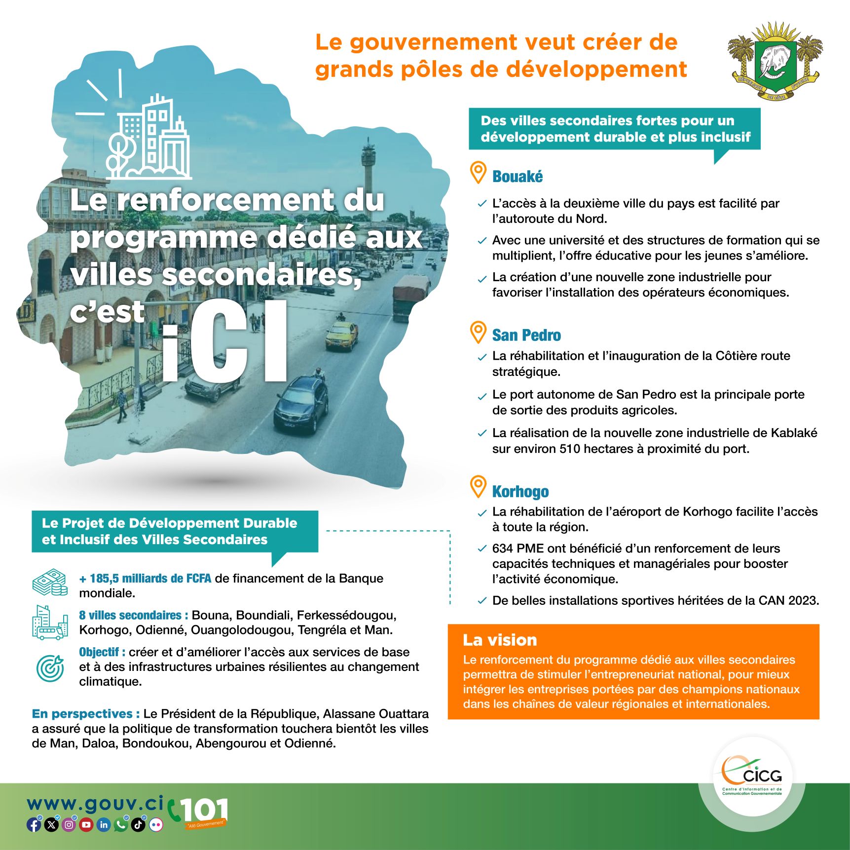 Pour le gouvernement ivoirien, le renforcement du programme dédié aux villes secondaires permettra de stimuler l’entrepreneuriat national, pour mieux intégrer les entreprises portées par des champions nationaux dans les chaînes de valeur régionales et internationales.