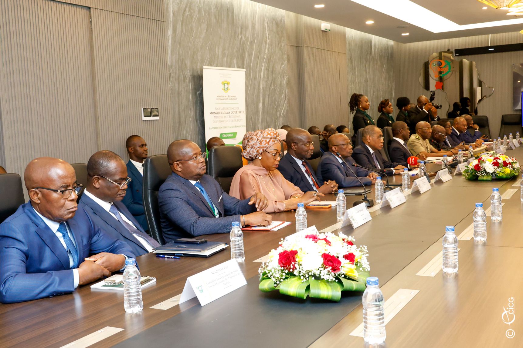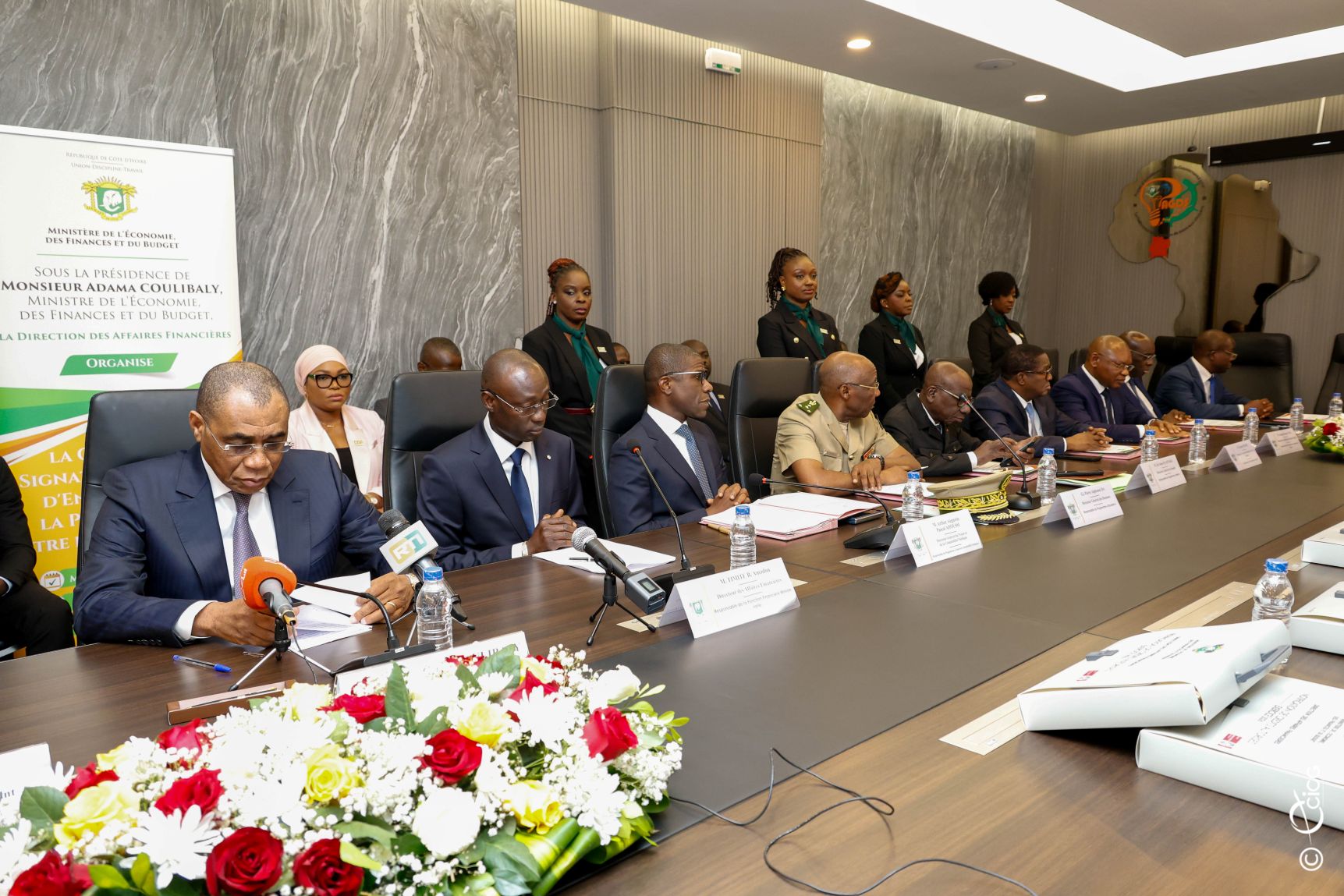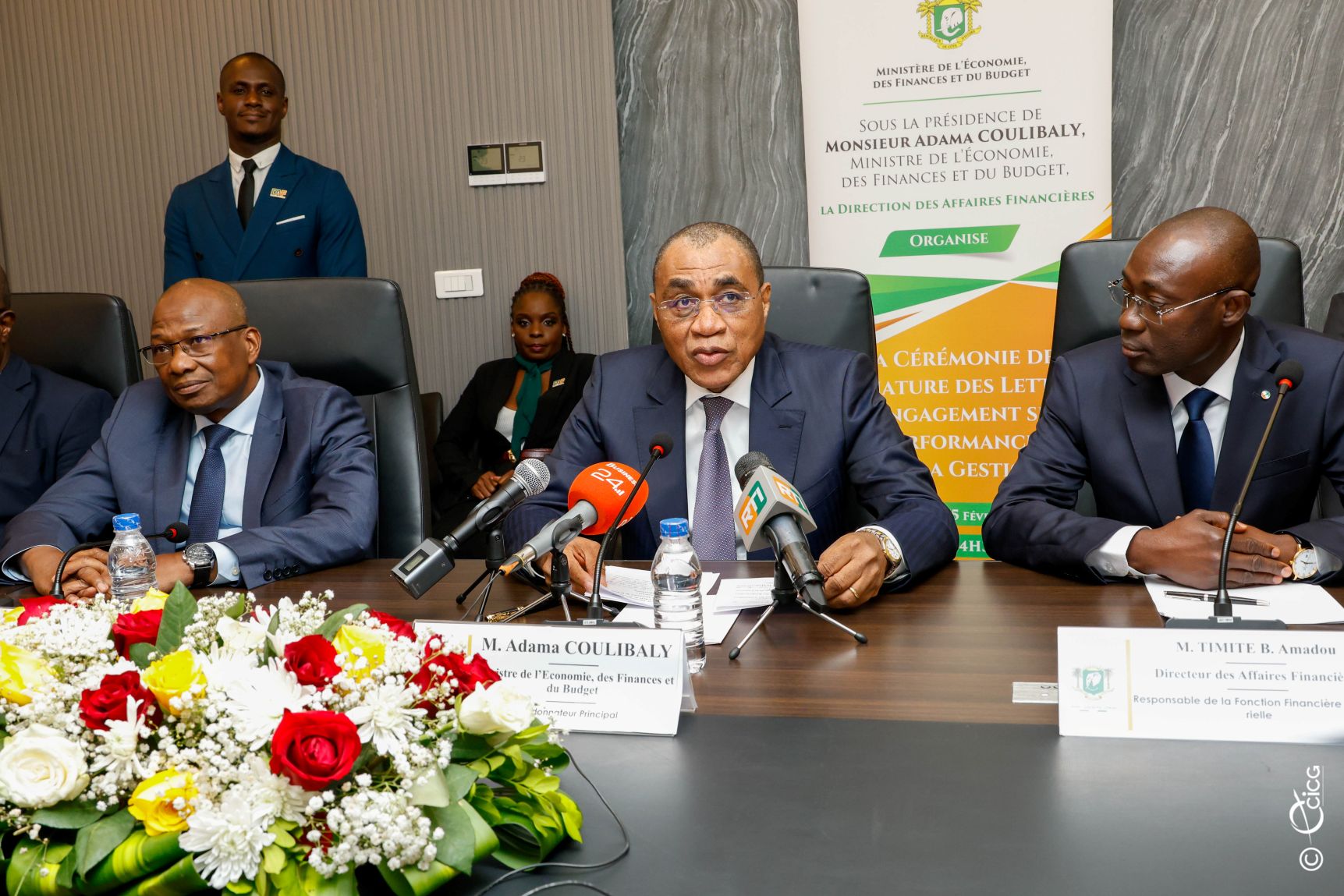Abidjan, le 26 février 2026- Le ministre de l'Économie, des Finances et du Budget, Adama Coulibaly, et les responsables de programmes de son ministère, notamment des Marchés publics, du Budget, des Impôts, du Trésor et de la comptabilité publique, de l'Administration générale, des Douanes, de la Gestion des financements, et de la Gestion macro-économique et politique économique et financière, ont signé officiellement les lettres d'engagement sur la performance pour l'exercice 2026.