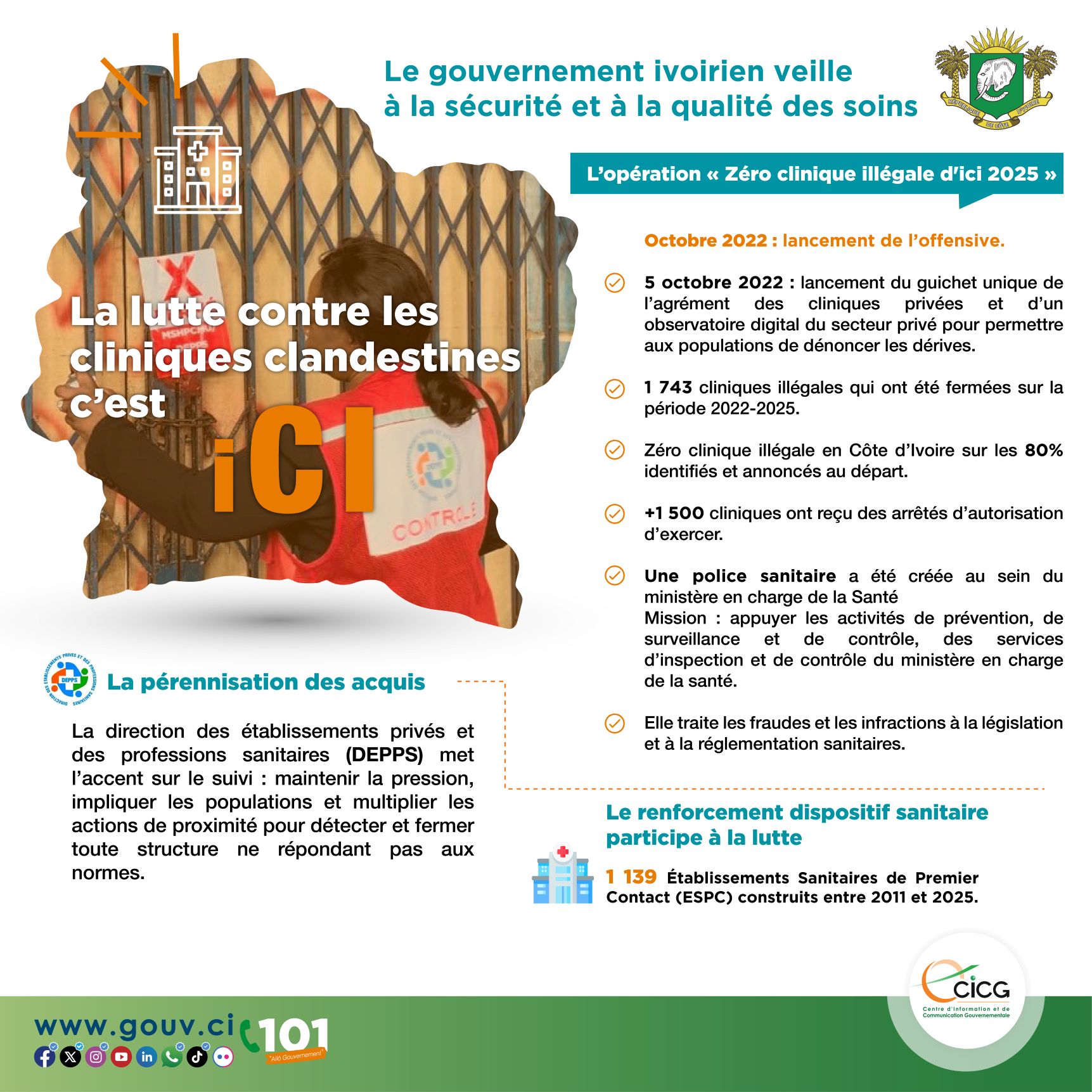 C’est en octobre 2022, que le gouvernement a lancé l’opération « Zéro clinique illégale d'ici 2025 ». Cet objectif sur le terrain se traduit par l’intensification de la traque de ces établissements à Abidjan et à l’intérieur de pays. De nombreux établissements sanitaires privés ont été fermés à l’issue de contrôles effectués par la DEPPS. Dans la région du Cavally par exemple, sur 123 cliniques visitées du 18 au 22 mars 2024, 118 avaient été fermées.