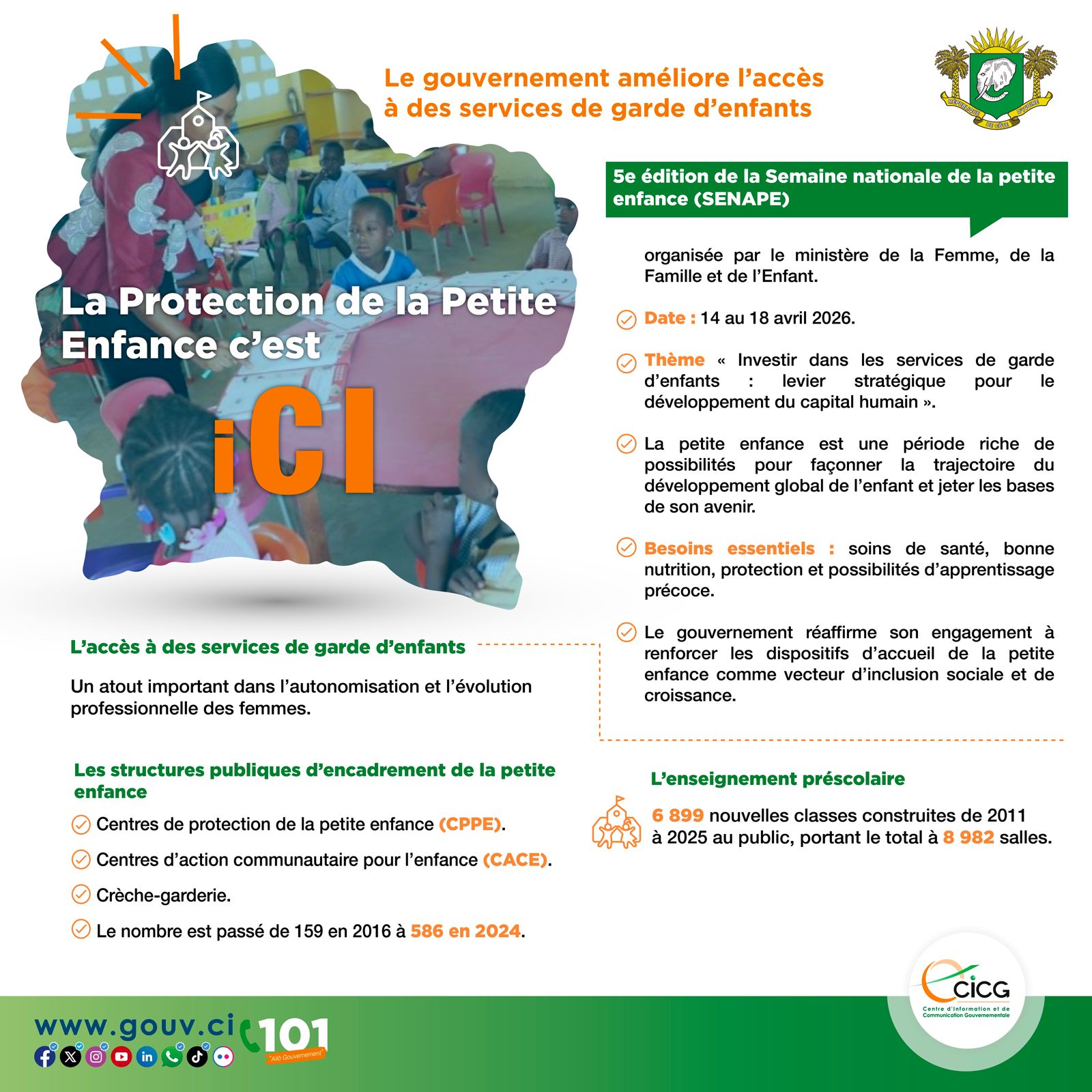 Permettre aux jeunes enfants du pays de bénéficier d’un bon suivi partout où ils vivent afin de faciliter le chemin de l’apprentissage et leur plein épanouissement. C’est dans cette dynamique que la question des services de garde s’est invitée à la 5e édition de la Semaine nationale de la petite enfance (Senape) organisée par le ministère de la Femme, de la Famille et de l’Enfant du 14 au 18 avril 2026, qui avait pour thème « Investir dans les services de garde d’enfants : levier stratégique pour le développement du capital humain ». Soulignant l’engagement du gouvernement à renforcer les dispositifs d’accueil de la petite enfance comme vecteur d’inclusion sociale et de croissance. En effet, la Côte d’Ivoire a réalisé d’importants investissements tant dans l’enseignement préscolaire que les Centres de protection de la petite enfance (Ceppe) qui relèvent du ministère en charge de l’Enfant. Les experts estiment que la petite enfance est une période riche de possibilités pour façonner la trajectoire du développement global de l’enfant et jeter les bases de son avenir. Sans oublier que l’accès à des services de garde est un atout important dans l’autonomisation et l’évolution professionnelle des femmes. D’où les efforts du gouvernement pour rapprocher les services de garde d’enfants des communautés, même en zone rurale.