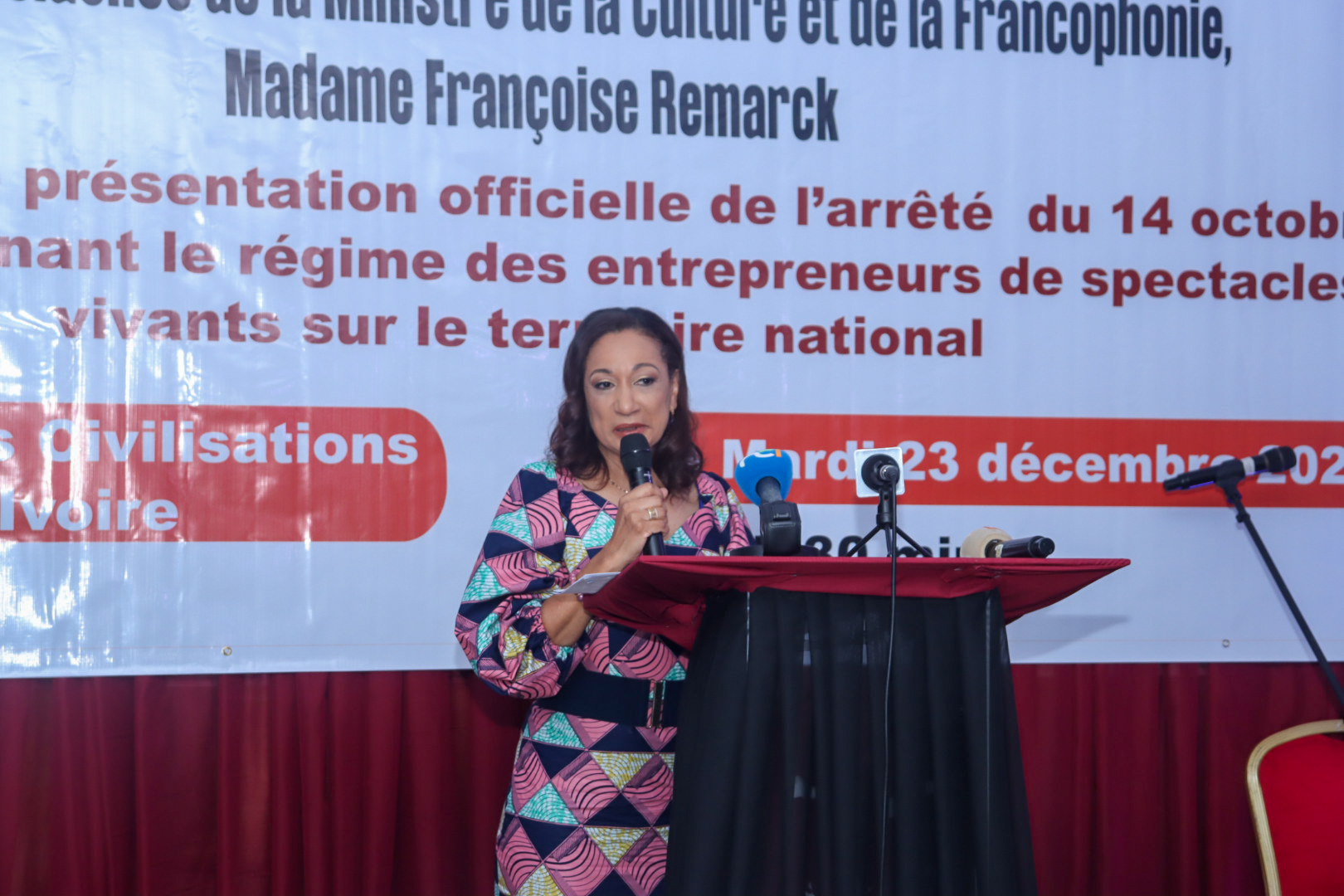 Abidjan, le 23 décembre 2025- L'arrêté n°750/MCF/CAB du 14 octobre 2025 déterminant le régime des entrepreneurs de spectacles vivants sur le territoire national, et visant à offrir un cadre juridique clair, sécurisé et moderne aux acteurs du secteur, a été officiellement présenté en présence de la ministre de la Culture et de la Francophonie, Françoise Remarck, le mardi 23 décembre 2025, au Musée des Civilisations à Abidjan-Plateau.
